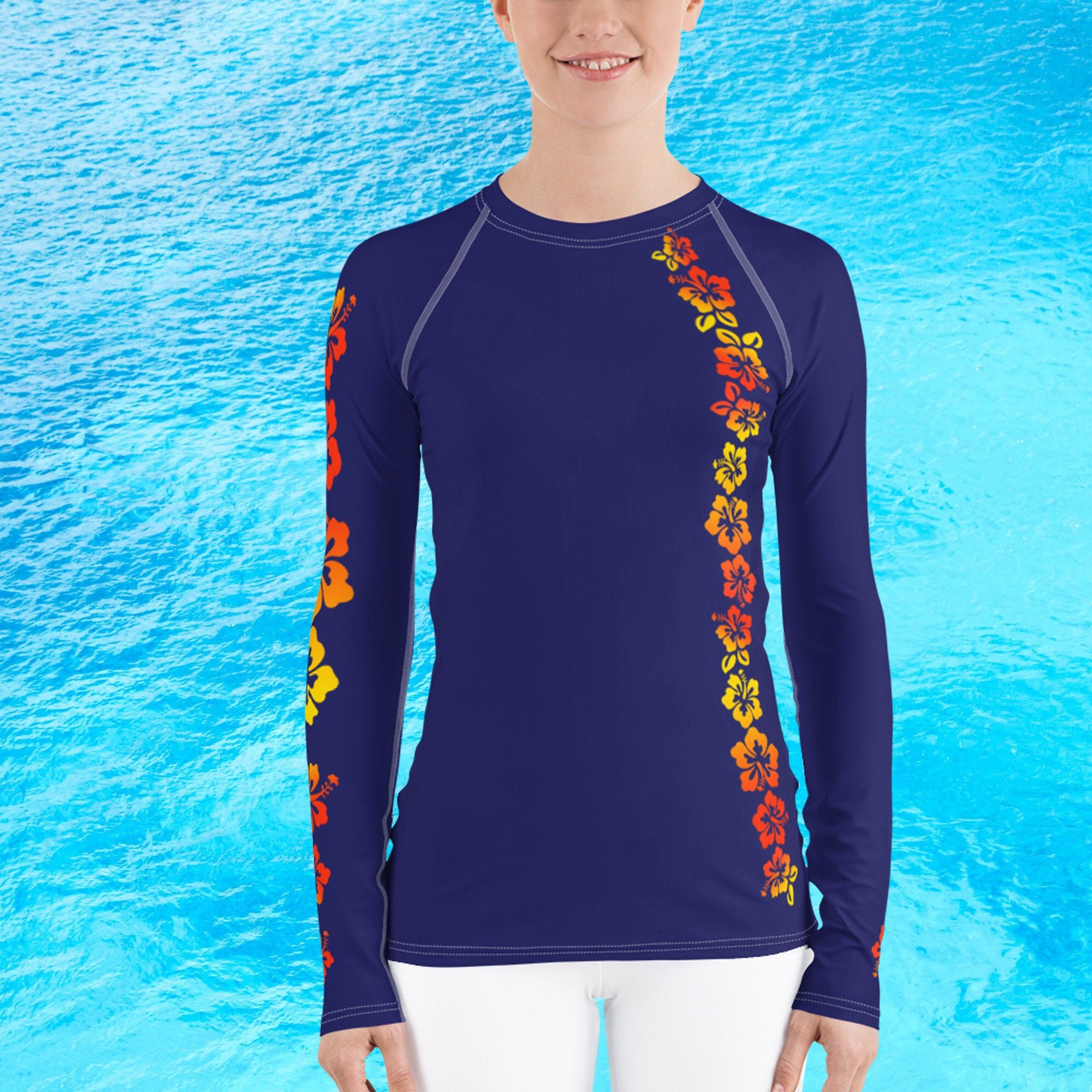 Women S Navy Rash Guard With Orange To Yellow Hibiscus Etsy Australia
